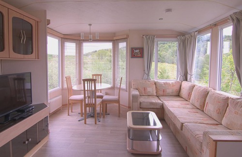 This newly refurbished static home is situated in the grounds of large private garden. 3 steps lead up to the entrance hall with plenty hooks for jackets. To your left is a large, bright open plan lounge/kitchen/dining area with panoramic views of the countryside and hills. The lounge has a 4 seat comfy settee, coffee table, wood burning stove and TV with Freesat. The dining area has a round table with 4 chairs. The fully equipped kitchen has a breakfast bar and 4 ring gas cooker, grill and oven, microwave oven, kettle, toaster, fridge and dish washer.