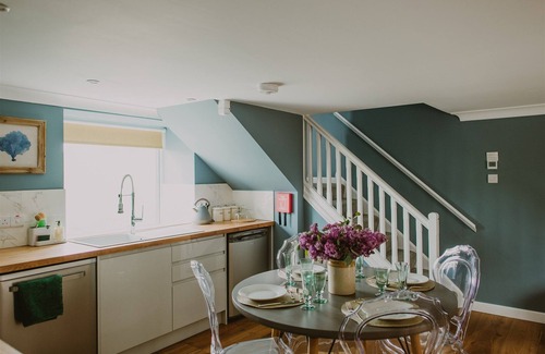 The second bedroom takes up the entire top floor. Here you'll find pale lemon walls with a Botticelli-inspired headboard, in the shape of a seashell. An exceptionally comfortable king size bed awaits you, with meadowland mural to evoke dreams of rambles. A contained bathroom features a rain shower and in-room basin.