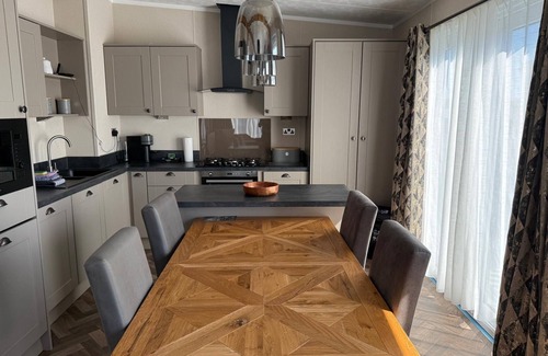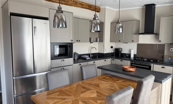 As a self-catering lodge, you'll find everything you need for a perfect stay. The kitchen is very modern and includes an island as well as a freestanding American-style fridge freezer, the perfect home-from-home!