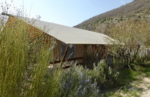 An old renovated farmhouse, lodges of canvas and wood, unspoiled nature, a large infinity pool overlooking the valley ...