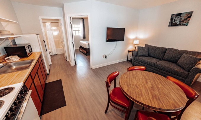 In our one-bedroom apartment type A, the separated bedroom hosts a queen size bed with a generous space in upgraded armoires and furniture. Enjoy a tub/shower combination in the bathroom. Amenities include a full kitchen with stove, oven, toaster, refrigerator with freezer, coffee maker, cookware, bakeware, and plenty of dishes. With an additional queen sleeper sofa in the living room, this apartment can accommodate up to 4 guests.