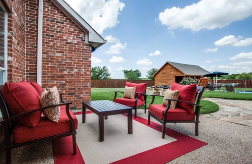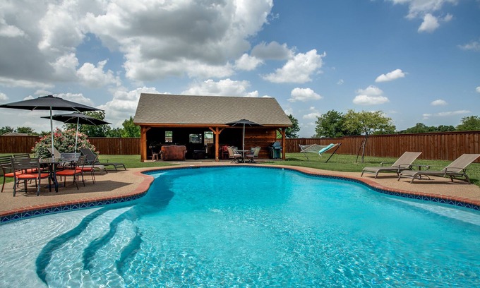 Our Weekend getaway package is for 2 nights of lodging up to 12 guest and up to 2 events on our property. You will have your own private estate to host your wedding and guests. Our new barn has a unique rustic/elegant flare with a capacity of up to 130 people. Exterior of the barn is Western Red Cedar and Oklahoma Chop Stone that is stacked with no mortar joints. Interior features100 year old barn wood, Oklahoma Chop stacked stone, floor to ceiling Austin Chalk stone fireplace, Polished concrete floors, large men's/women's bathrooms, prep kitchen, bar, and covered outdoor areas. Our outdoor ceremony area is private with a 50 foot walk way to a covered Arbor. We just updated our Ceremony site with artificial turf. Plenty of photo oops at our landscaped meandering crushed granite pathway that crosses over a bridge leading to 10 foot arched Cedar gates. Home is fully furnished and equipped with a warming kitchen, bath towels and linens. The pool area is surrounded by a large privacy fence and a beautiful Cedar Cabana. We look forward to your stay! We are able to sleep 16 in beds between the house and guest house. We look forward to hosting your special day!! Reach out @The Melissa Barn for pricing