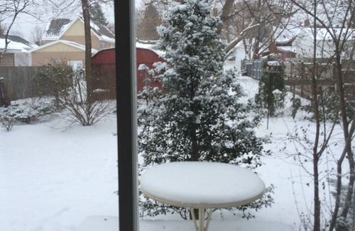 A low deck overlooking the quiet yard is a great place to read or birdwatch.