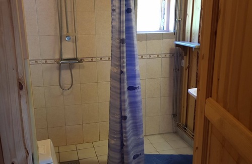 Behind the dwelling house, about 100 meters away, there is a house with a wood sauna in one part, and in the other part a room with a washing machine. This servicehouse is shared with another cottage which is about 200 meters away.