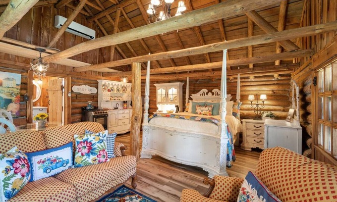 Come enjoy the beautiful Happy Hound real log cabin in Rudy, AR (or one of the other 3 cabins at the same location)! The cabin is set on 100 acres of forest & pasture. You'll love the cozy feel of the cabin. Comfortable queen size bed. Living area with couch and a chair to enjoy the ambience of the faux fireplace and smart tv. Spacious table for two right off the completely functional kitchen with nearly fridge, range with cooktop and oven, coffee maker with coffee and toaster.