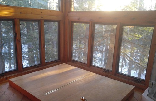 In the summer spend time on the large screened porch and decks. Great room has sliding doors leading to deck facing east surrounded by perennial garden. Natural light flows in through the three skylights above dining area. Master bedroom has a wall of glass and fireplace and the ensuite bath has skylights and glass all around.