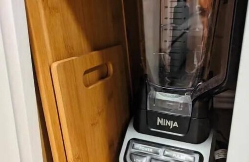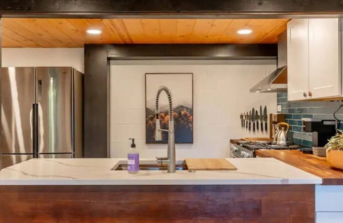 Enter the bedroom through the sliding barn door and relax on an incredibly comfy Purple Mattress. There's a full size closet for you to store your things in and you will find a clothing iron and ironing board for you to freshen up.