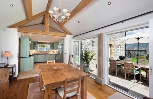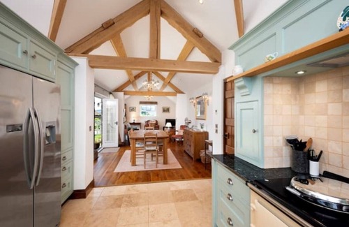 Downstairs, you enter from your own private drive to the hallway, which has coat hanging and boot storage. There is a large open plan kitchen/dining and sitting room with south-facing windows and bi-fold doors opening onto a large patio area. There is a modern, newly fitted kitchen with an AGA range, American fridge freezer and built in oven and microwave. The cottage provides cooking essentials, such as oil, condiments, sugar etc. There is a Tassimo Bosch coffee machine, as well as all the cooking equipment we think you'll need. The dining area will seat 6, and the living area has plenty of comfortable seating and exposed ceiling beams. The cottage is fully stocked with books and DVD's.