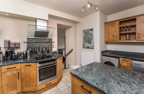 The property is entered via shared entrance hall and stairs. Entering the hallway there is hanging space and storage for outdoor gear. From here you find the fitted kitchen with fridge, freezer, electric oven and hob, microwave oven, washing machine and tumble dryer. The solid wood Pippy Oak units are of a high quality with granite worktops with small breakfast bar and views to Barf and Whinlatter.