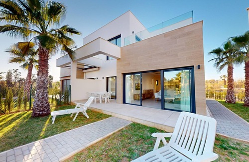 Exclusive Bungalow with a communal pool and golf course views. The ground floor features a kitchen, dining and living room with a restroom, as well as a master bedroom with an en-suite bathroom and access to the private garden. Upstairs, two bedrooms, a bathroom, and a spacious terrace with golf course views await you. Just 650 m from the beach and 1 km from the equestrian center, enjoy privacy in a gated plot. Experience unparalleled uniqueness and comfort at this exceptional vacation destination.
