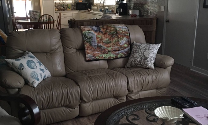 Living room sofa with double recliners plus queen sized air mattress if needed.
