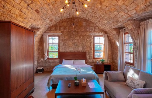 Our extraordinary stone house located in the heart of nature , it includes one king bedroom with living area that fits 1 extra bed along to accommodate 3 persons with fully equipped kitchen and bathroom, private rooftop and organic pool in addition to another shared pool access and garden access, bonfire access, barbecue access, internet access & concierge service available