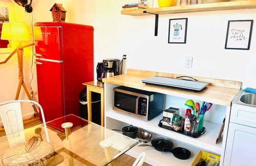 - Breakfast kitchenette with your own small refrigerator, a new fashioned microwave, tea kettle, and a modern coffee-maker. Please bring your favorite, ground coffee brand along. Induction cooktop, flatware, utensils, pot & pans.