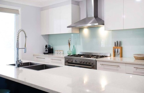 The kitchen is decked out with all the mod cons, Gas cooktop, Electric Oven, Breville Coffee Machine, Dishwasher and more. The main bathroom has a bathtub fit for a King, but only if he can get the Queen to give it up! The main bedroom has it’s own ensuite, located at the front of the house for parents own privacy. There are two lounge areas, one dedicated to the little ones with a DVD player and some DVD’s provided and let’s not forget the Trampoline out the backyard, ready for hours of jumping fun.