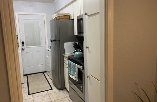 There are 3 smart ROKU TVs (1 in each bedroom and in living room), fully equipped kitchen, washer and dryer plus 1 covered and 1 uncovered parking space.