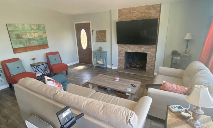 3 bd, 2 ba, private home w/ lovely backyard, 1 mi to beach/harbor. Linens, dishes, ROKU TV's, WiFi & driveway parking for 2 cars.