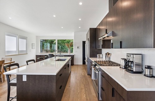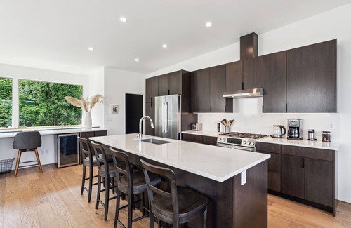 Stevie's View is a very lovely brand new townhome perched up just one street (and an easy walk, near the STAIRS) from the downtown core. Big views of the waterfront, and downtown from the balcony and north-facing windows. Room for everyone with 4 full bedrooms/ 3.5 baths, plus a bonus/media room with a pullout. Contemporary, high end finishes throughout. Quartz counters, engineered hardwood, SS Bosch appliances & white oak cabinets. Maximized views with reverse floor plan and living/ kitchen on top floor to enjoy the views. Large garage will accommodate cars and toys. There are 4 floors with many stairs. No smoking. No pets. License #784