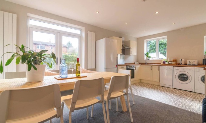 Modern 6-Bed Retreat: Your City Escape Unwind in our stylish 6-bedroom home, perfect for groups. Enjoy spacious living areas, 2 x luxurious bathrooms with rain shower feature, and blackout blinds for peaceful and secure nights. Key Features: 5 mins from Manchester Airport and Wilmslow Town 20 mins to City Centre, Etihad Stadium, Arena Lots of good pub, take away, good resturant near by Free Parking Free Wifi , Sky TV/ Nexflix Near tram and bus stops Hotel quality