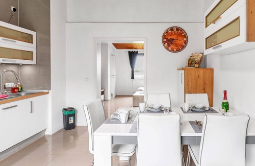 The house comes with a large kitchen that includes an oven, dishwasher, four ceramic glass hob hotplates, toaster, kettle, and an electric coffee machine. There is also a dining table in the kitchen area. The property has two bathrooms or showers and is equipped with gas heating. Wi-Fi internet access is provided free of charge. Other amenities include a barbecue, fireplace, private patio, heat available, and television. The house can accommodate up to six people and has three bedrooms and two bathrooms.