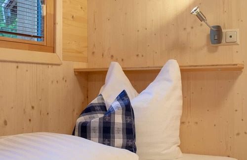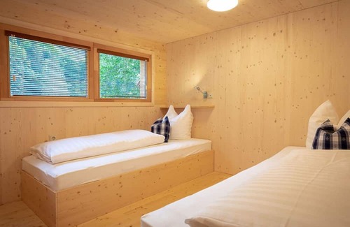 "Glamping Lodge A", 2-room mobile home 33 m2. Object suitable for 2 adults + 2 children. Cosy and wooden furniture furnishings: living/dining room with dining table, kitchen corner and satellite TV (flat screen). Exit to the terrace. 1 double bedroom. Gallery with 1 double bed. Kitchenette (oven, dishwasher, 2 ceramic glass hob hotplates, kettle, electric coffee machine). Shower/WC. Heating. Parquet floors. Terrace furniture. Facilities: hair dryer. Internet (WiFi, free). Please note: non-smokers only. Guests have free access to the nearby See-Areal lido in Steindorf. Instead of an enclosed bedroom, some sleeping areas are located in an open-plan area (gallery, alcove, etc.).
