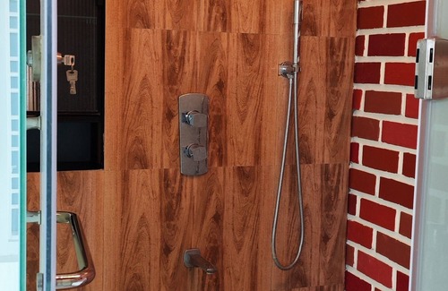 Shower room with thermostatic diverter (head, hand, and faucet outlets)