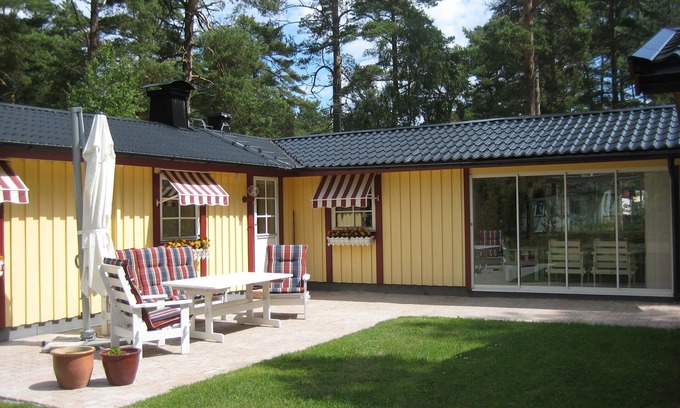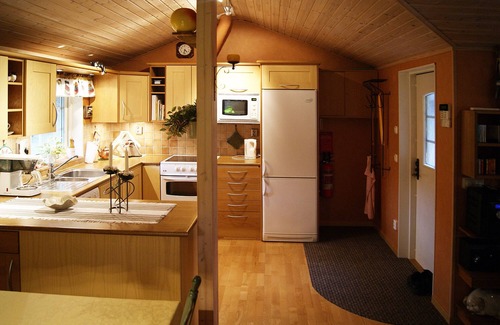 Cottage of 70 m² and outdoor space (the outside room is not winter bean) of about 16 m2. Nice living room with kitchen and dining area are open plan. The kitchen is fully equipped with stove, fridge and freezer, microwave, dishwasher, coffee maker and kettle. In the living room stove create both warmth and coziness (wood included in the rent). TV (with several Allente channels, also German channels), DVD and radio / CD. available. The cottage has two bedrooms, one double and one with twin beds, all with comfortable spring mattresses. The tiled bathroom has underfloor heating and contains a shower, toilet and washbasin with washstand. There is also a laundry room with washing machine. Hot summer days can be enjoyed on the terrace with wooden garden furniture with soft cushions and large parasol and barbecue. Sometimes it's wonderful to be in the glazed conservatory with comfortable furniture and enjoy the day. At Easter and Christmas holidays, the cottage atmospheric lavishly. Free Wifi is included.