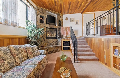 Spectacular. Asian feng shui motifs and decor transport guests to a timeless, far distant calm and serenity. The king-size bed has been lowered to simulate the floor-level rice beds of Japan, and the owner-built headboard not only incorporates a lumbar-support feature but also matches the custom iron railing, lamps, flowering tree and side tables. The bath continues the Asian theme with a spacious custom marble walk-in shower and a large corner whirlpool tub--one wall of which houses a second TV with stereo sound. A local artisan crafted the stained-glass shower window and door. Behind the oriental screen above the headboard are a kitchenette area with microwave, coffee maker, and refrigerator and a morning make-up and primping area. Below the foot of the bed is a sunken sitting room with a love seat, recliner, fireplace and built-in surround sound satellite TV/DVD system. The semi-detached suite has convenient ground-level access from the parking area, an interior entrance from the main front porch, and off the sitting room area a private porch with steps to the oriental garden and outdoor spa.