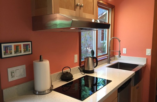 Marvel at all the beautiful repurposed old growth redwood that graces the pergola, window sills, door casings and frames the stained glass windows created by a local artisan and friend, Tangerine Steinbrecher - Atmospheric Glass. Kitchen cabinetry custom made by a local woodworker and teacher at the Kernov Fine Woodworking School in Fort Bragg - Greg Smith. You will certainly feel all the love and energy that went into revitalizing this magical little cottage!