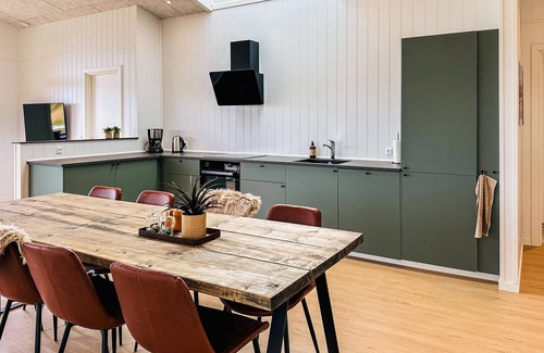 Elegance and rusticity come together harmoniously in this holiday home clad in light-coloured wood. Floor-to-ceiling windows let in plenty of natural light, while warm wood and a cosy sofa create a relaxed atmosphere. Whether you're streaming your favourite series, playing a game of pool or preparing delicious meals together in the modern kitchen, you can organise the day at your own pace.