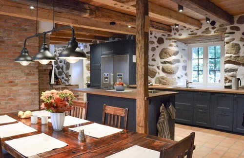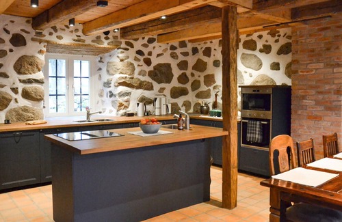 The historic house in Sallerup near Hörby impresses with its preserved details and combines traditional charm with modern comfort. Large communal areas and high-quality furnishings offer you and your family plenty of space to feel at home. Prepare delicious meals in the beautiful country kitchen, which creates a warm atmosphere with rustic wooden beams and natural stone walls. Enjoy your meals together at the spacious dining table, surrounded by authentic flair. Relax in the stylishly furnished living area, which offers a unique backdrop with its natural stone walls and cosy furniture.