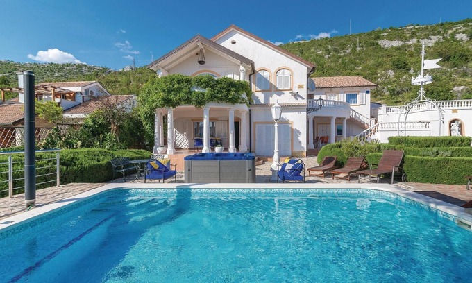 If you choose this vacation home as your vacation residence, you are assured of a magnificent panoramic view. This luxurious villa consists of five separate and differently designed living units, which are connected by external staircases. All units are very tastefully and modernly furnished. Four of these units have their own fireplace. Bedroom 1 runs over 2 levels. Here there is a round double bed and a picture with the family tree of the royal family Kotromanic. In front of the generously sized pool there are sun loungers for you to relax, where you can also enjoy the impressive panorama. The same can be said of the covered terrace, where more cozy garden furniture is waiting for you to settle down and relax in them. In the living room, stylish and very tasteful furnishings and decoration await you. On cool evenings, the beautiful fireplace stove radiates soothing warmth and invites you to cozy up. Furthermore, in the villa you will find numerous works of art from the collection of the family of the house owner. On the first floor there is a small kitchen with a spacious dining room. The long table will comfortably seat your family, ideal for sharing vacation experiences. The spacious yard offers ideal conditions for playing children. Beautiful pebble and sandy beaches are just a few kilometers away, the towns of Seline and Starigrad-Paklenica and invite guests to sunbathe and swim. In the nearby surroundings you also have many opportunities to spend your vacation actively and culturally.