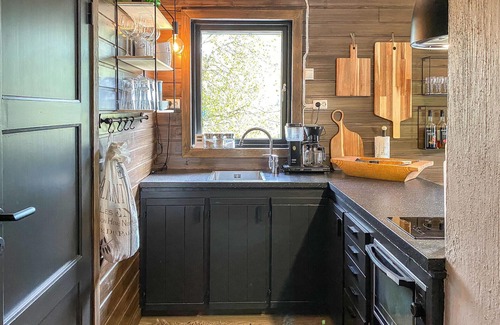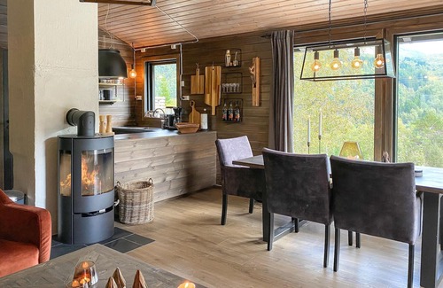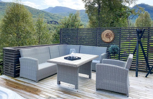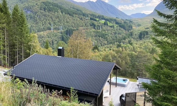 Look forward to this fantastic vacation idyll near Stordal and make this cozy cottage your home. In the high-quality interior, you can cozy up in the evenings with a fireplace and entertaining movie and before that enjoy the view in the hot tub and barbecues on the terrace. You can start your mornings with a daily outdoor shower before gathering around the dining table for breakfast.