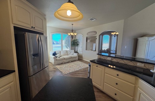 Located in Lubbock, enjoy what this 4-bedroom, 3 bathroom house has to offer. Two bedrooms have King Size beds with ensuite bathrooms. This lovely property features 2 king beds, 1 twin bed, and 1 queen bed, perfect for families or groups of friends. With amenities like WiFi, AC, a washer and dryer, heating, and a jetted bathtub. Guests can relax and unwind in this charming home. We hope you'll enjoy your stay at our house.