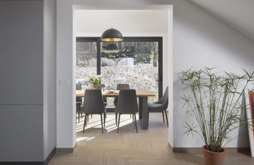 The two-story villa inspires a cozy feeling of home from the moment you step inside. Fully air-conditioned, it features 4 bedrooms, each with a TV and an adjoining bathroom. In addition to the spacious living room, there is a well- Find the ideal place to rest in the modern Villa Arman with the perfect view of the Istrian countryside! equipped kitchen with a dining room and a kitchen island, just perfect for a quick bite. The delightfully decorated open-concept ground floor has large patio doors opening onto a paved terrace with a garden.