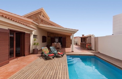 Villa with private pool located in the best urbanization of Puerto del Rosario. It has 3 bedrooms, modern kitchen with office, living room, 2 bathrooms, toilet, barbecue, covered terraces and solarium. Equipped with all appliances, TV, DVD, satellite, PS2, wifi, etc. 10 minutes from the airport and Playa Blanca. Supermarket and tennis or paddle courts 5 minutes walk. Ideal for families.
