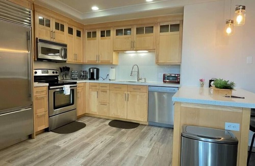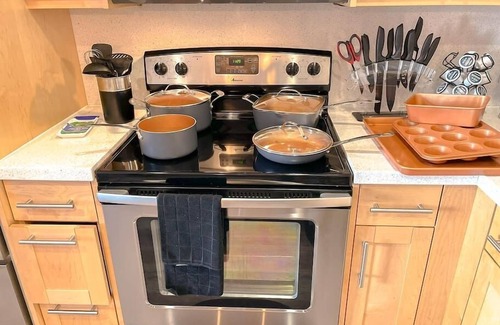 It is fully equipped with modern cooking appliances that make it suitable for preparing any meal, whether a simple breakfast, quick snack, or a three-course gourmet dinner. Spacious countertops extend into a breakfast bar and provide plenty of room to work your MasterChef magic.