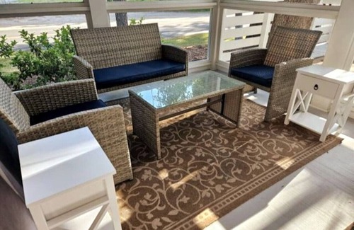 Our beautiful single-level home has both a front and rear entrance. Interior flooring consists of hardwood (hallway, dining room, and living room) carpet (both bedrooms), and tile (bathrooms). A fully equipped kitchen includes stools by a center island, plenty of counter space, and many cabinets. You will have access to the outside on a fully screened porch accessible via sliding doors plus an open patio. A BBQ is positioned on the open porch along with a fire pit. Near the front of the interior is a utility room with a washing machine and dryer accompanied by a work table and oversized sink. Please note that we deploy outdoor cameras in order to monitor the property. Prior approval of pets is required.