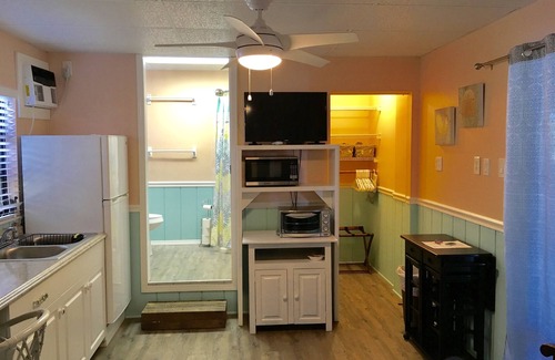 Great studio apartment with kitchenette that has a full size refrigerator, coffee maker, Nuwave oven, microwave, and hot eye for cooking. TV is located in the main living area. There is 1 Queen bed. There is a full bath inside with shower and outside shower. There are also 2 chairs for relaxing in to watch tv. It is approximately 400 sq ft.