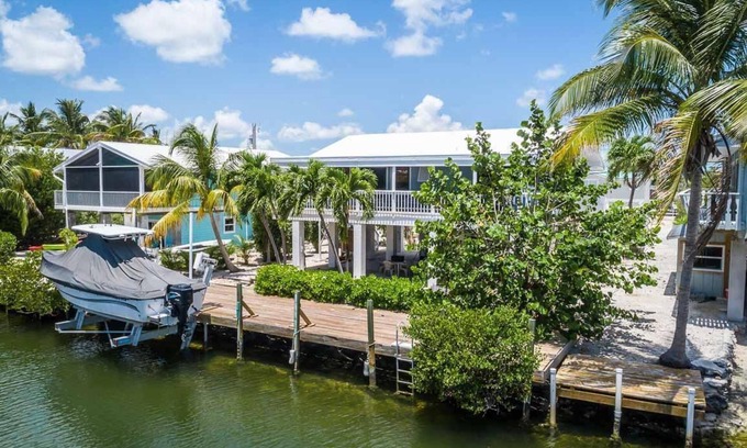 Enjoy your stay at our beautiful Keys home! With a 60 ft waterfront dock--- only 3 canals from the Atlantic, there is plenty of room to keep your boat, use our kayaks and paddleboards, or sit and sip your favorite cocktail (the picture is older and all foliage around the dock has been removed, approx 32 ft of dockage before the boat lift). The 1,300 sq ft house features an open floorplan, 2 bedrooms (sleeping 6), pullout sofa bed (sleeps 2), and 2 bathrooms. We also have a "pack-n-play" and a bed guard rail for use if needed. The huge wrap-around covered porch is the perfect spot to have morning coffee or afternoon happy hour.