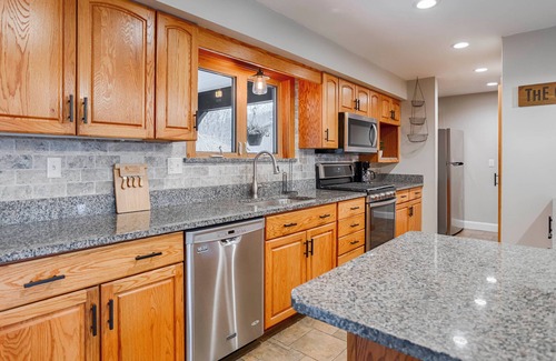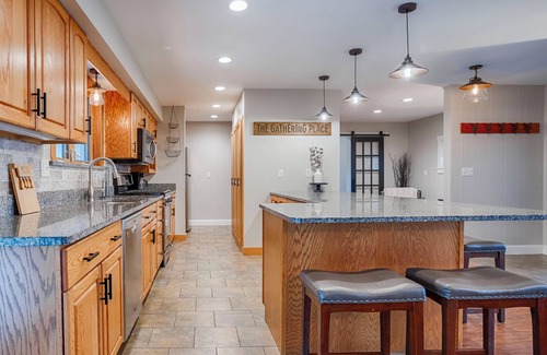 Upon entering this cozy home, the kitchen happily greets you. The open galley kitchen allows the chef in your group to prepare everyone's favorite meals while still being a part of the fun. An expansive island countertop allows your guests to gather 'round.