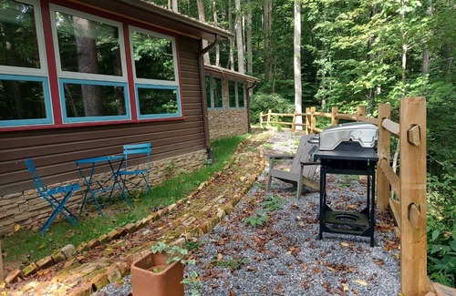 A gem of a location. Mature, private woodland provides a backdrop for all of the windows inside the cabin. Long range mountain views can be seen outside. You can watch wildlife from your living room and bedroom windows, such as pheasants, woodpeckers, red squirrels, deer, and many varieties of song birds right on property. Hiking trails are on site, and biking and fishing are available by the river within walking distance.