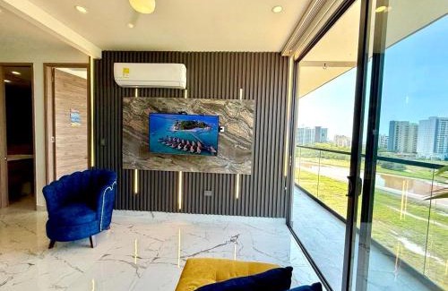 Lujoso apto con vista al mar, en salinas del mar is a recently renovated apartment in Playa Dormida where guests can make the most of its outdoor swimming pool, fitness center, and garden. This property offers access to a balcony, free private parking, and free Wifi. The apartment has a terrace and a hot tub. The spacious apartment is composed of 2 bedrooms, a living room, a fully equipped kitchen, and 3 bathrooms. A flat-screen TV is featured. The property offers sea views. Bello Horizonte is a 19-minute walk from the apartment, while Rodadero Sea Aquarium and Museum is 5.4 miles away. Simón Bolívar International Airport is 2.5 miles from the property.
