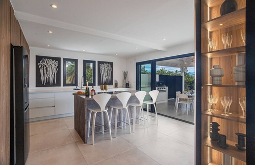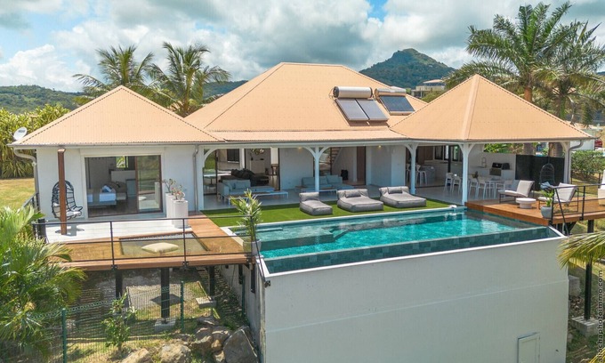With its sweeping 180° vista, the terrace serves as the heart of the villa. Whether as a lounge or dining area, it beckons you to savor the balmy Caribbean climate. Sink into plush armchairs for moments of pure relaxation during the sun-drenched hours. Encircled by a deck furnished with inviting garden loungers, the 9x3.5 meter pool invites you to unwind completely. From here, the view is simply mesmerizing: verdant greenery as far as the eye can see, juxtaposed against the turquoise expanse of the ocean and the distant coral reef. The villa is rated 5*.Marrying traditional architecture, modern comforts, and chic Creole aesthetics, villa Luna Moona stands as a beacon of luxury, where enchantment unfolds swiftly.