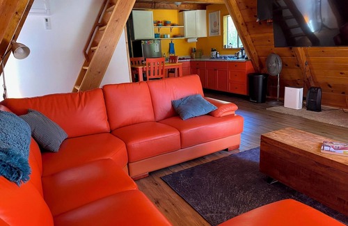 ▲ Lunar Landing ▲ Pet friendly, colorful A-Frame cabin with barrel sauna | Cottage in Bodfish