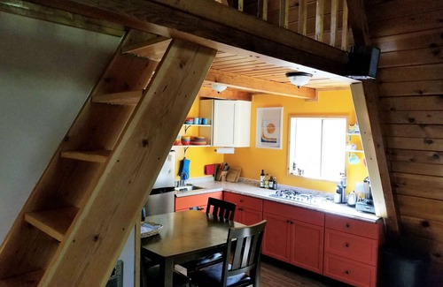 Come relax and enjoy the charm of this 800 square foot mid-60’s A-frame cottage, with knotty pine interior and exposed timber structure. The space is fully furnished with one queen bed on the ground level, and two beds in the loft (full and twin). The fully-stocked kitchenette and bathroom have been recently upgraded with new fixtures, including a bathtub to soak in after a long day of adventures.