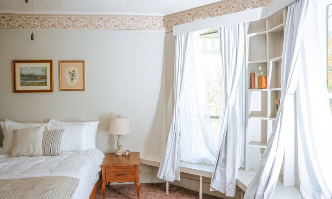 Lupine Room is an upstairs queen bedroom at the Bluebird Inn with lots of Victorian charm. Enjoy the historic house and grounds, built in the 1870s, and a cherished house in Etna. Read a book in the shade, enjoy a warm coffee on the porch, or take a short walk to downtown Etna.