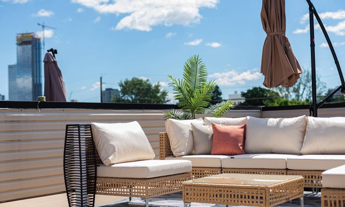 The house features a bonus roof deck with a comfortable outdoor furniture. Spend time with friends and family and watch the sunset and stunning views of One World Trade Center New York.