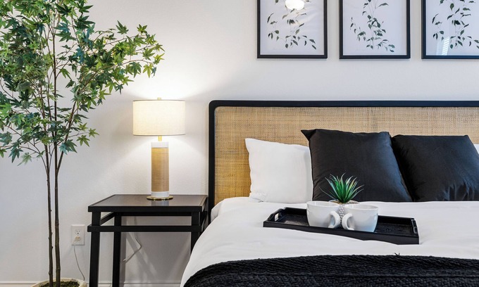 This single story 9ft ceiling home has everything you need for a comfortable stay. The kitchen is fully equipped and the home also includes a garage gym space and desk area to serve as dedicated work space