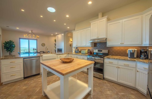 Well-stocked gourmet kitchen with large oven, 5-burner stove, microwave, Keurig and drip coffee makers. Plenty of counter space with 6 bar stools, kitchen table with seating for 6 and dining room table seating for 12, allows plenty of room for everyone. Enjoy a cozy fire while dining in the spacious dining room. Reverse Osmosis (RO) water and whole house water filtration runs throughout.