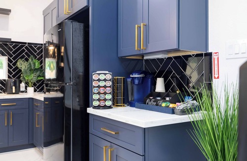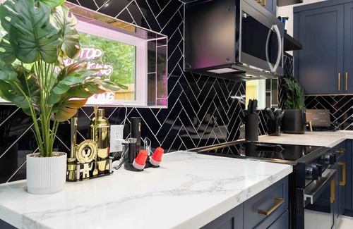 The Space, full private access to the entire home with free parking. Bold navy walls, sleek gold accents, marble floors, Neon signs.